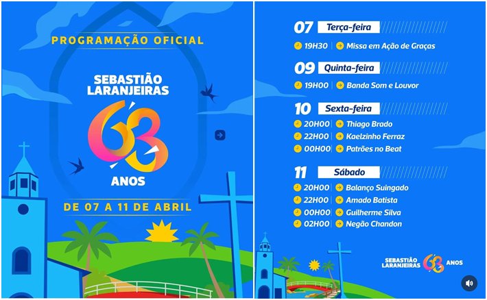 “Preparamos uma programação especial com muito carinho para celebrar os 63 anos de Sebastião Laranjeiras. Convido toda a população, além dos amigos da região, para participarem dessa grande festa. Será um momento de alegria, união e valorização da nossa cidade”, afirmou.