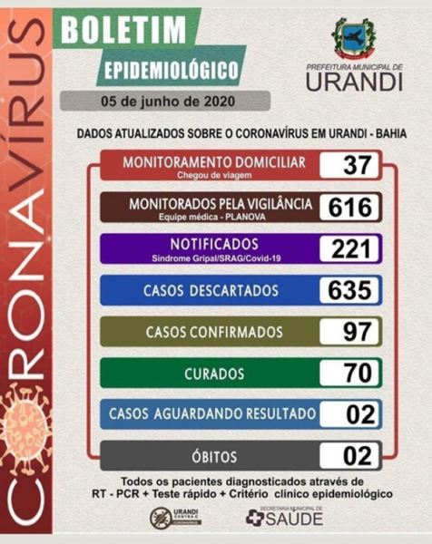 A Secretaria Municipal de Saúde de Urandi, confirmou mais 8 novos casos da Covid-19 no município, através de teste rápido, conforme boletim epidemiológico divulgado na tarde desta sexta-feira (5). O total de pessoas contaminadas chegou a 97, destes, 70 já estão curadas. [confira o boletim]
