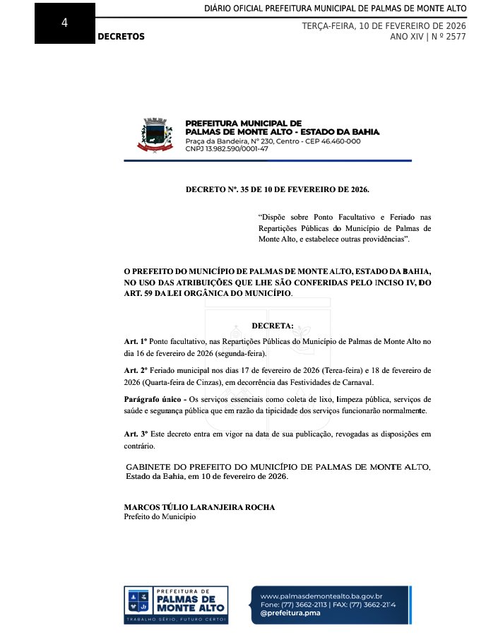 A Prefeitura de Palmas de Monte Alto (BA) decretou ponto facultativo e feriado nas repartições públicas municipais em razão das festividades de Carnaval.