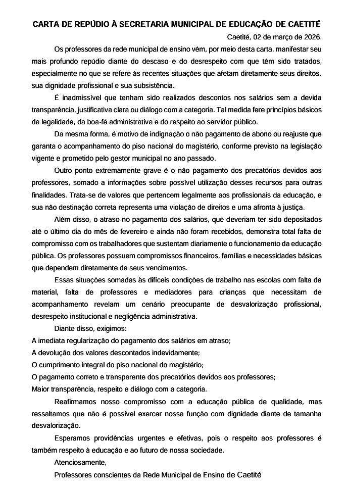 A reportagem do Portal Vilson Nunes manteve contato com a Ascom da Prefeitura de Caetité, que informou que irá se manifestar sobre a carta por meio de nota ainda hoje. [confira a carta na íntegra]