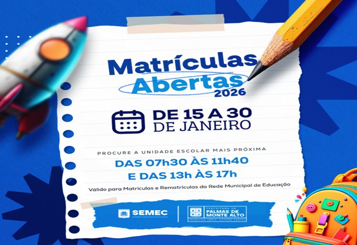 As matrículas e rematrículas da Rede Municipal de Educação para o ano letivo de 2026 já estão abertas no município de Palmas de Monte Alto (BA). O período segue de 15 a 30 de janeiro, e os responsáveis devem procurar a unidade escolar mais próxima para garantir a vaga dos estudantes.
