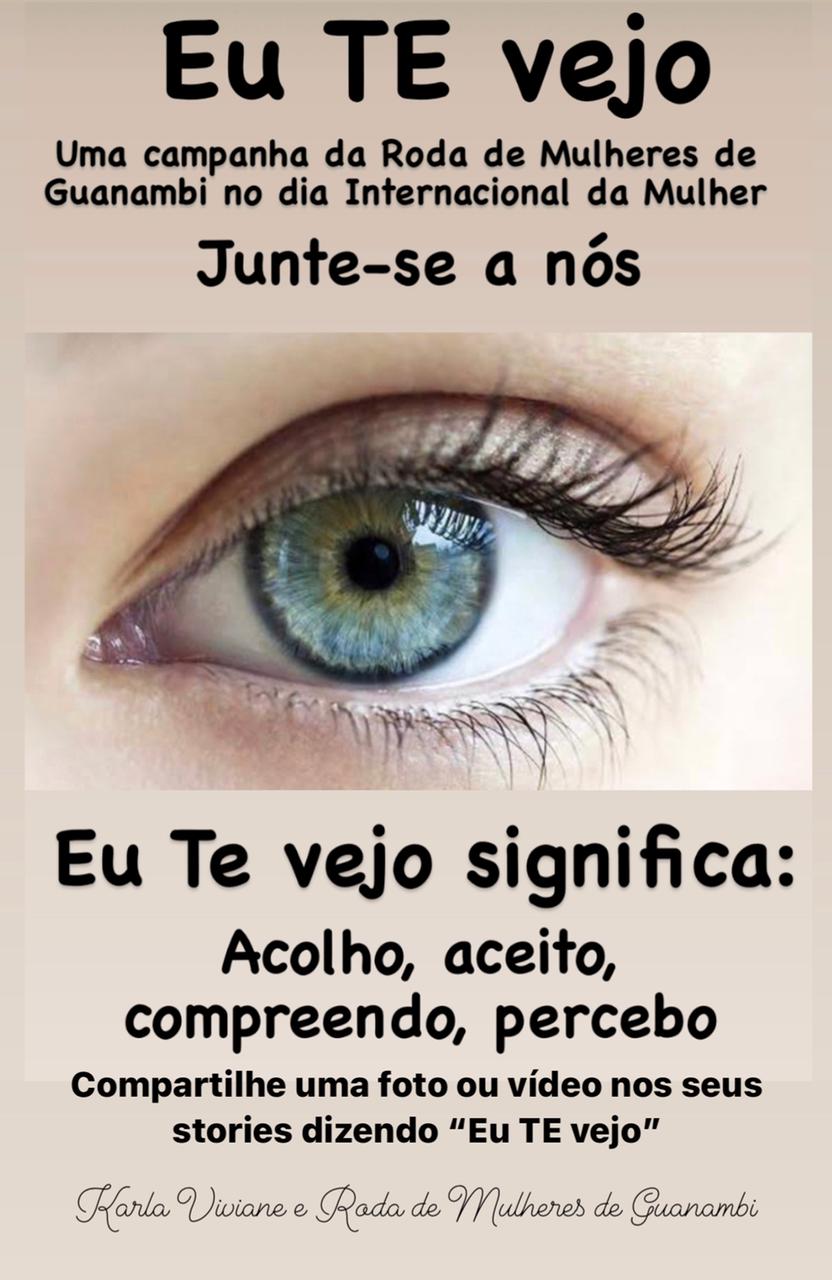 Essa singela Campanha da Roda de Mulheres de Guanambi nasceu como ação para o dia 8 de Março, Dia Internacional da Mulher em um ano de pandemia. É um chamado para que entendamos o quanto somos interdependentes, o quanto precisamos uns dos outros. Daí, o “Eu TE vejo”. Essa máxima significa: recebo você, acolho, entendo, convivo e aceito. Eu não apenas vejo você, eu enxergo e percebo você com suas dificuldades, beleza e diferenças. Em comum aqui, a vontade de nos unirmos estimulando o melhor em nós, uma existência isenta de julgamentos e preconceitos. Só vê o outro quem consegue se ver e se aceitar. É um exercício amoroso e consciencioso. Reconheça o outro como semelhante. Somos filhos de um mesmo pai e consequentemente, somos irmãos. Vocês se lembram da saudação em Zulu? Sawubona! Também significa “Eu TE vejo”, e na África eles respondem com Shikoba que significa “Então eu existo para você”, sendo assim te respeito e valorizo. “O desejo mais profundo do coração humano é ver o outro e ser visto pelo olhar amoroso do outro”. (Santo Agostinho).
