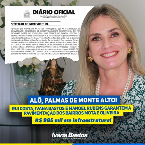 Como resultado do trabalho da deputada Ivana Bastos e do prefeito Manoel Rubens, junto ao governador Rui Costa, mais de R$ 885 mil foram garantidos para as obras de pavimentação asfáltica em diversas ruas dos bairros Mota e Oliveira em Palmas de Monte Alto. O convênio para a realização das obras foi publicado pela Conder no Diário Oficial do Estado desta segunda-feira (06).