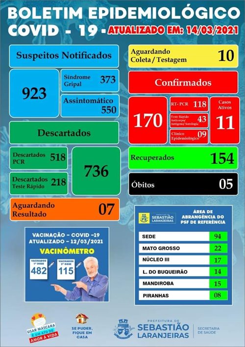 Ainda de acordo informações constantes no boletim epidemiológico, até então já foram notificados 923 casos suspeitos da doença, 736 foram descartados, 7 aguardam resultado, e 10 aguardam coleta para testagem.