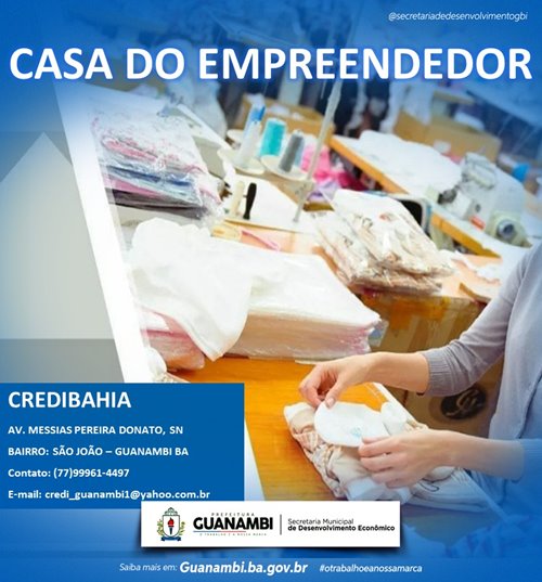 A Prefeitura municipal de Guanambi, através da Secretaria de Desenvolvimento Econômico e em parceria com o Desenbahia, apoia o desenvolvimento das empresas locais por meio da concessão de linhas de crédito com juros acessíveis, de forma ágil e desburocratizada, fomentando o desenvolvimento econômico local.
