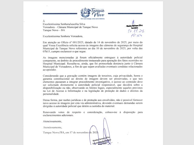 A vereadora de Tanque Novo solicitou à Secretaria Municipal de Saúde o acesso às imagens do Hospital Municipal referentes ao dia em que esteve na unidade, porém o pedido foi negado pelo secretário Wesley Carneiro Silva. No documento enviado à parlamentar, o secretário informou que as gravações já haviam sido entregues à polícia e que, por conterem imagens de terceiros, não poderiam ser disponibilizadas pela via administrativa.