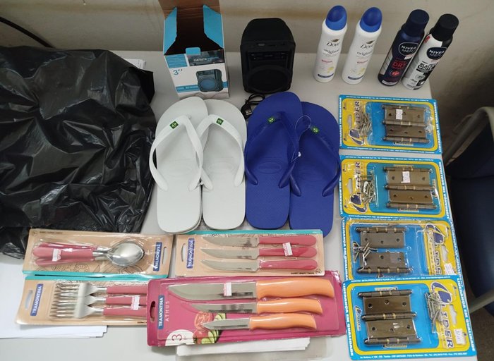 Durante a abordagem, foram encontrados diversos objetos com o indivíduo. Questionado, ele confessou que os materiais eram provenientes de furtos realizados em comércios locais.