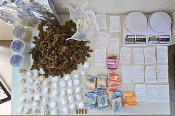 Ao todo, foram apreendidos mais de meio quilo de maconha, porções de crack e cocaína já fracionadas para comercialização, comprimidos de ecstasy, munições de calibre 9mm, duas balanças de precisão, materiais utilizados para embalagem de drogas, dinheiro em espécie e comprovantes de depósitos.