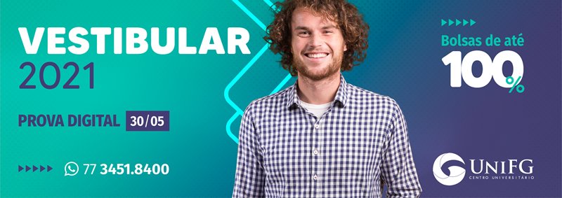 O Centro Universitário UniFG abriu o período de inscrições para o Vestibular 2021.2. As inscrições são gratuitas e os candidatos farão a prova on-line no dia 30 de maio. Ao fazer a prova, o candidato concorre a bolsas de estudos de até 100%. Para se inscrever, os interessados devem acessar o site venhaserunifg.com.br/vestibular/.