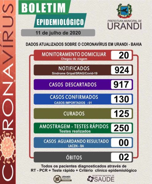 Em boletim epidemiológico divulgado neste sábado (11), a Secretaria Municipal de Saúde de Urandi, confirmou que 125 pessoas já estão curadas da Covid-19 no município. Agora, conforme os dados, apenas 5 pacientes permanecem em tratamento.