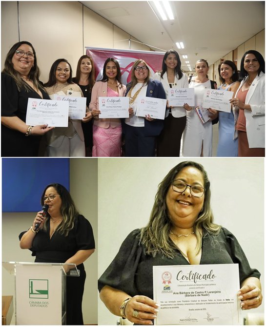 A vereadora de Palmas de Monte Ato, Ana Bárbara de Castro Pinto Laranjeira, conhecida como Bárbara de Nadir, tomou posse como presidente estadual da ABRACAM Mulher na Bahia, em cerimônia realizada na Câmara dos Deputados, em Brasília, nesta quarta-feira (29).
